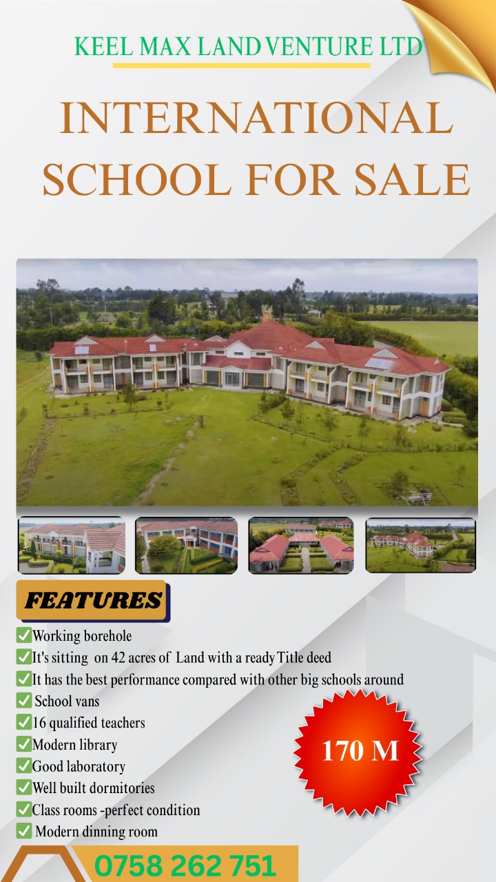 Keel Max Land Venture Ltd presents this modern international school for sale, strategically located on a spacious 42-acre parcel of land with a ready title deed. The property offers a fully established educational institution designed to meet international standards and provide a conducive learning environment.